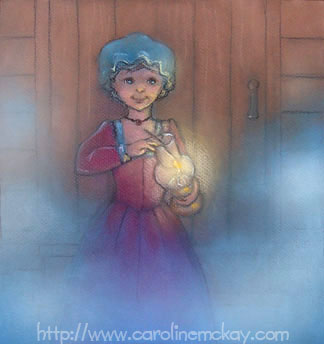 "The Fog" was an early reader assignment for Hartcourt School Publishers. It gave me the chance to create some historical pieces, and work with a story with lots of atmosphere. Here Tom's mother retrieves a lamp when he becomes afraid of the fog. Soft Pastel on Canson paper |